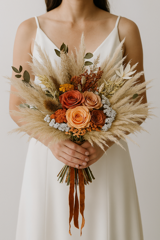 Autumn Bohemian Bridal Bouquet - Pampas Grass and Preserved Roses