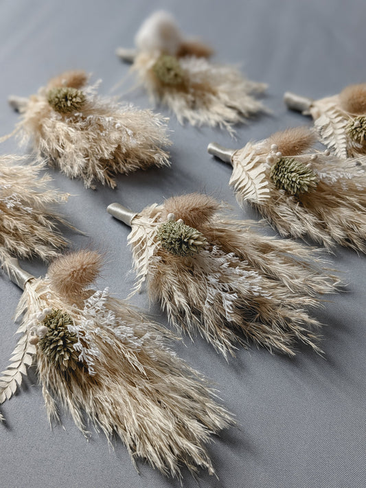 Choose eucalyptus and gypsophila for something different. Go for pampas grass for texture and movement. Add warmth with burnt orange tones that stand out without going too bold. These dried flower buttonholes are a great fit for grooms, groomsmen, or guests who want something different.