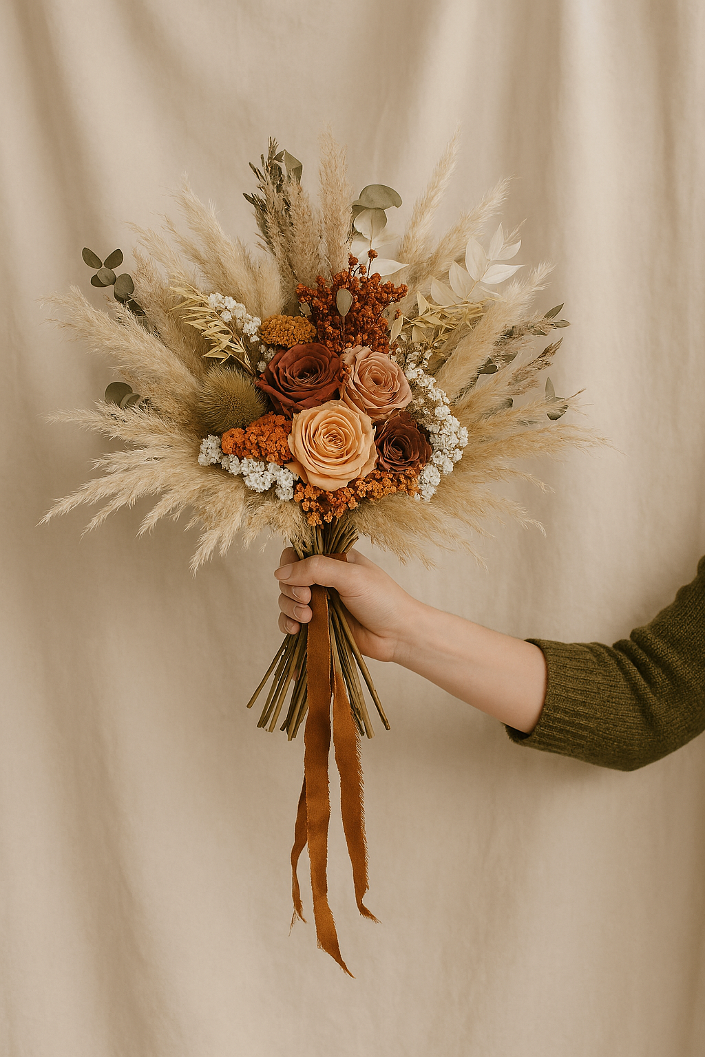 Autumn Bohemian Bridal Bouquet - Pampas Grass and Preserved Roses