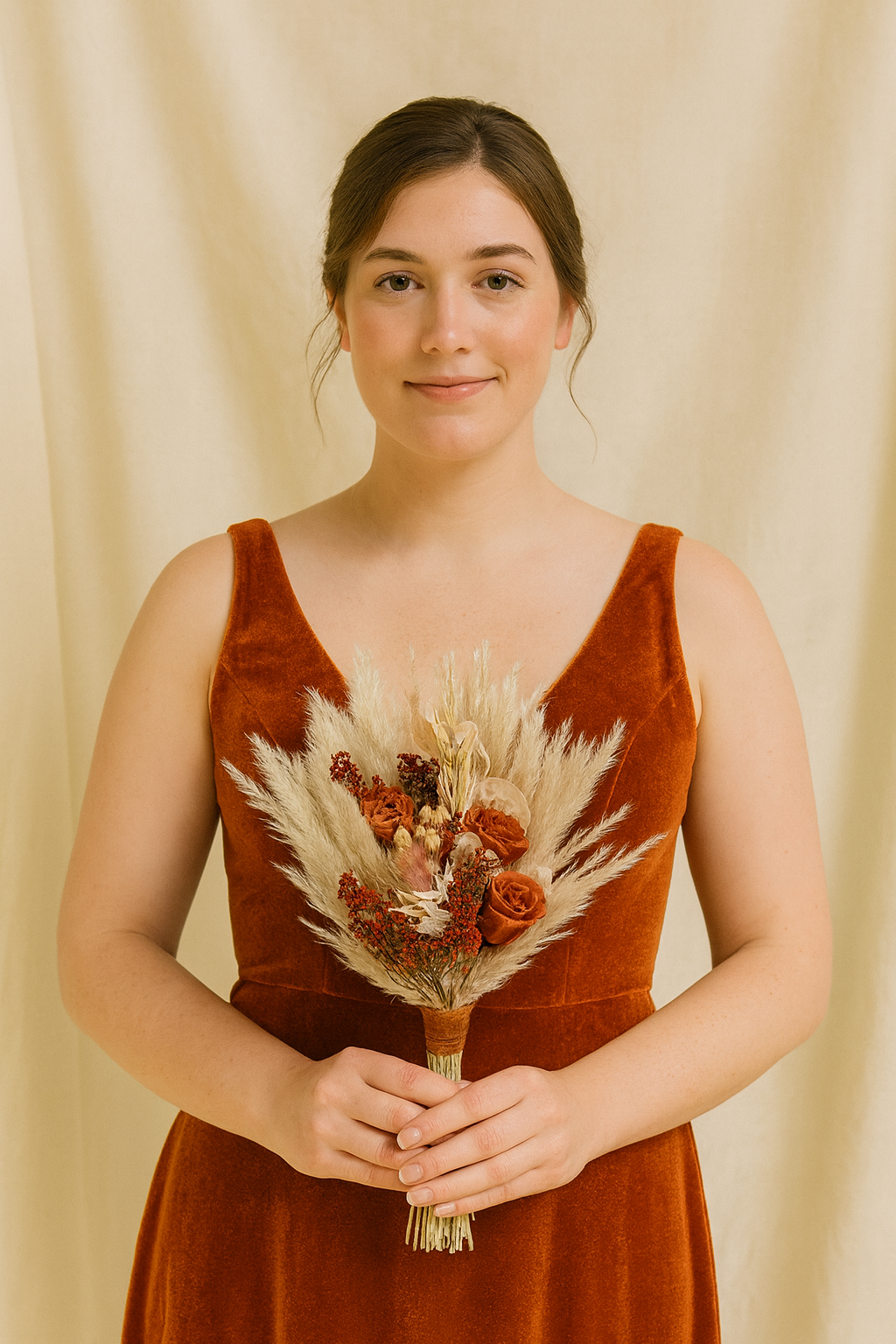 Add a touch of rustic charm and free-spirited elegance to your wedding with our "Autumn Dreamer Bridal Bouquet." It showcases a beautiful blend of autumnal hues and delicate blush accents, crafted with dried and preserved flowers to capture the essence of the fall season.