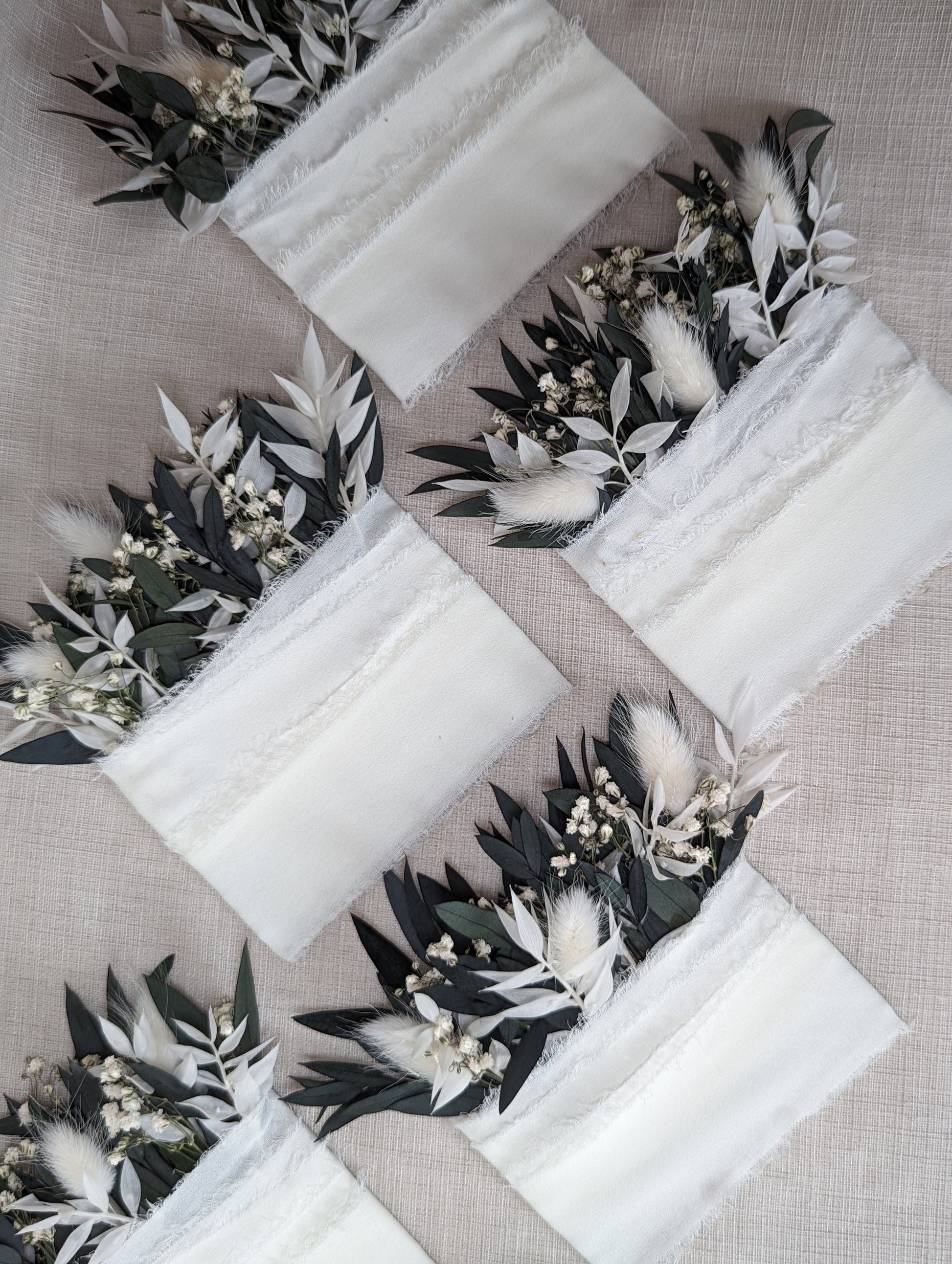 Stunning dried flower pocket squares made using a variety of delicate eucalyptus and other delicate dried florals.