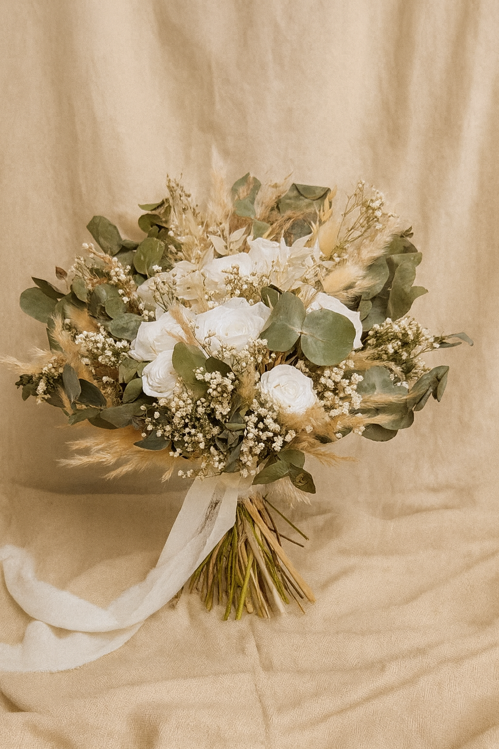 Every stem is dried, so there’s no rushing to keep it fresh. You can order in advance and know it will still look perfect when you need it. The eucalyptus adds a fresh scent and soft green tones. Pampas brings movement. Baby’s breath adds lightness. And the roses speak for themselves. Elegant, simple, and romantic.