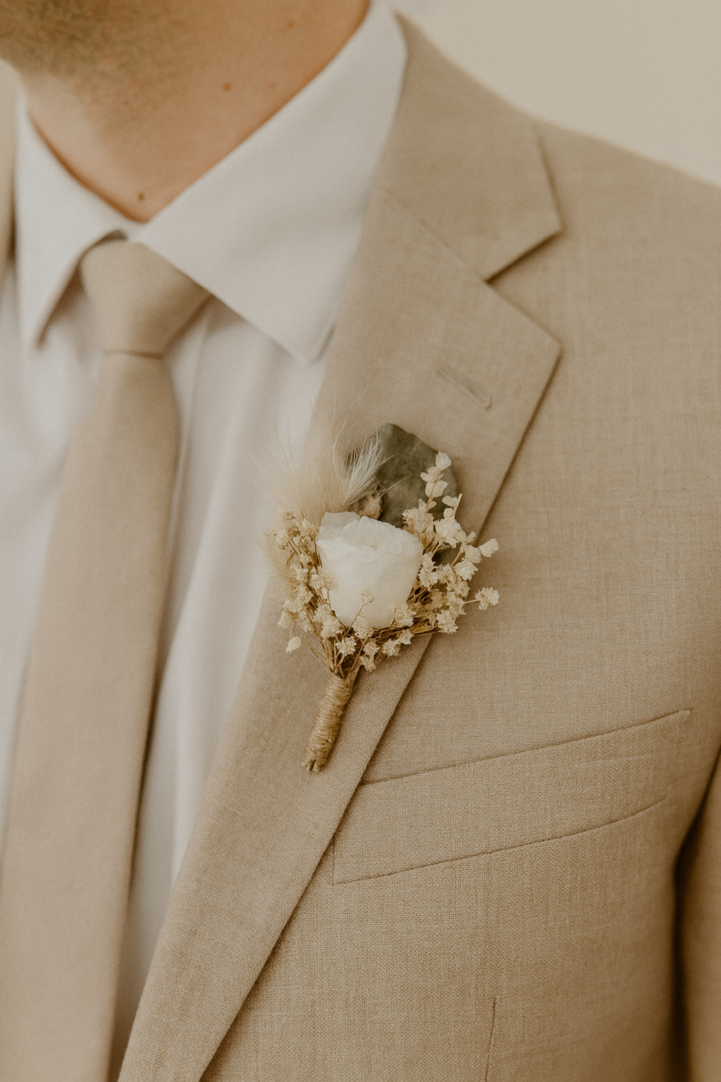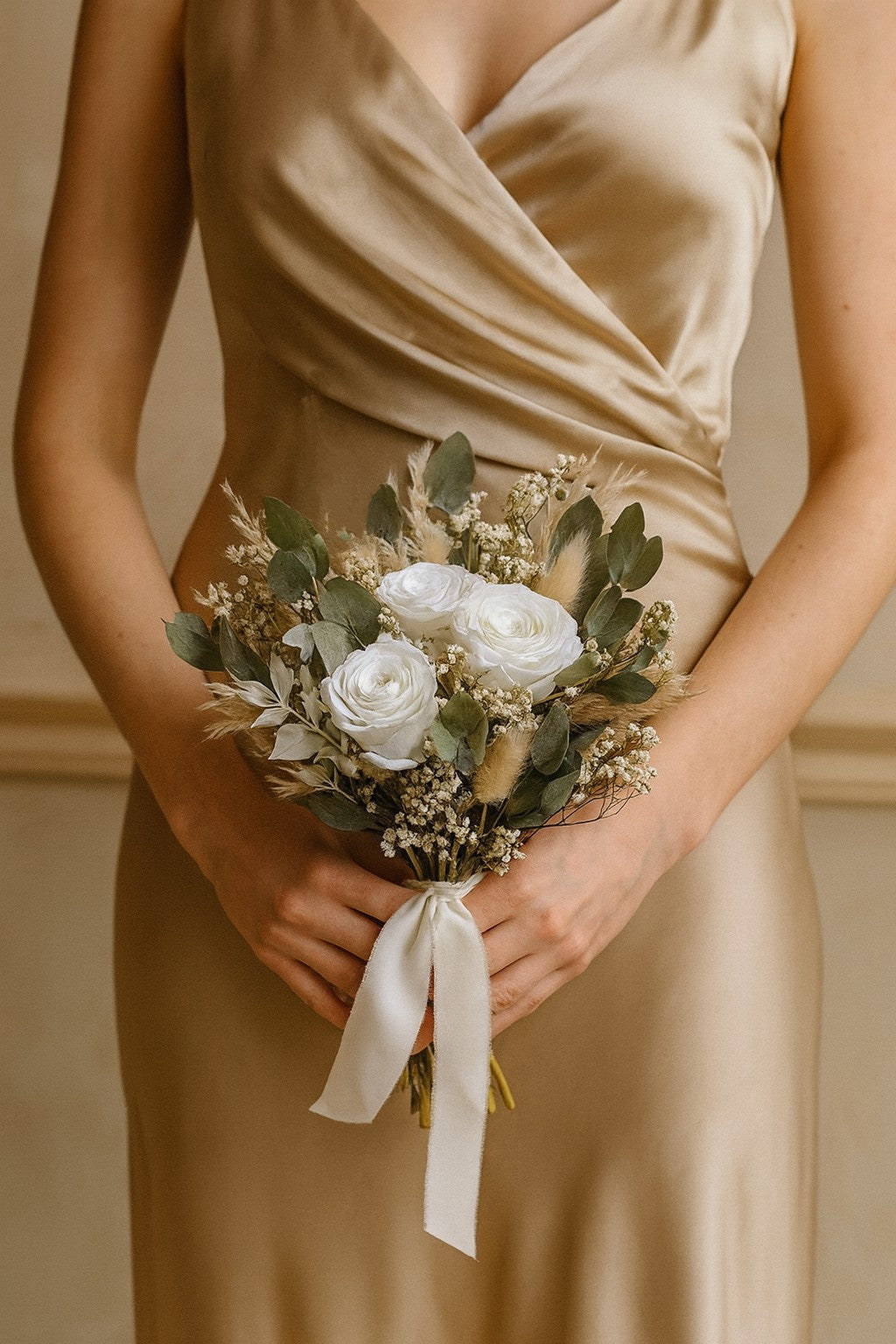 There’s something about white roses. Timeless. Gentle. Full of meaning. Paired with soft pampas grass, sprigs of eucalyptus, and delicate baby’s breath, this dried flower bridal bouquet has a calm, natural feel that fits right into your wedding day.
