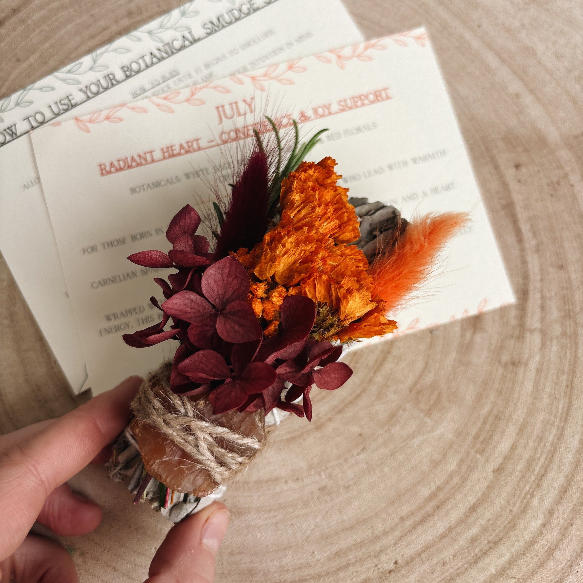 Each order includes ritual instructions, care guidance, and a note sharing the meaning behind your smudge stick’s botanicals and crystal - complete with a gentle affirmation to ground your ritual in intention.